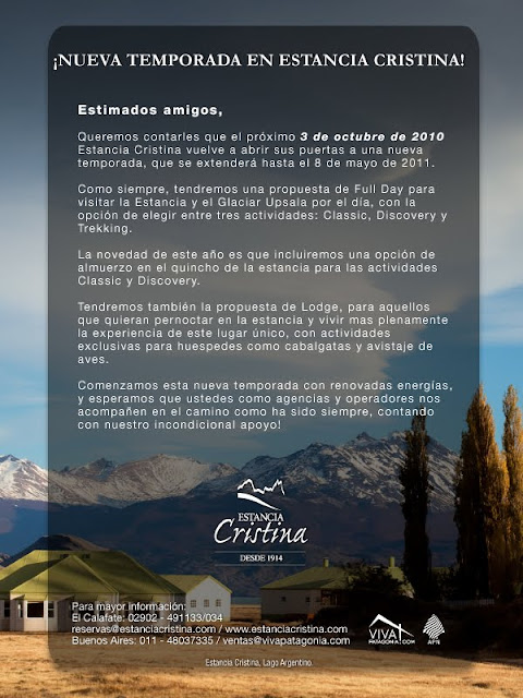El Calafate, Agosto de 2010. El próximo 3 de Octubre, Estancia Cristina volverá a abrir sus puertas para quienes deseen experimentar la combinación perfecta de naturaleza, historia y placer. Las novedades de esta temporada, que se extenderá hasta el 8 de mayo de 2011, incluyen la opción de almuerzo en el quincho de la Estancia durante las excursiones Classic y Discovery y la incorporación del trasbordador Janet que contara con 60 asientos.